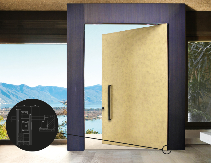 Sistema di apertura pivotante che ruota intono al proprio asse verticale, non necessita di stipiti integrandosi perfettamente a ogni facciata e parete. Le cerniere sono inoltre integrate nel pannello garantendo la massima funzionalità senza intaccarne l’estetica.
