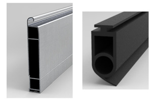 Das untere Element besteht aus einem stranggepressten Aluminiumprofil, das je nach den gewünschten Abmessungen und Leistungen mit einer einfachen oder doppelten Stahlverstärkung und einer Gummidichtung versehen ist.